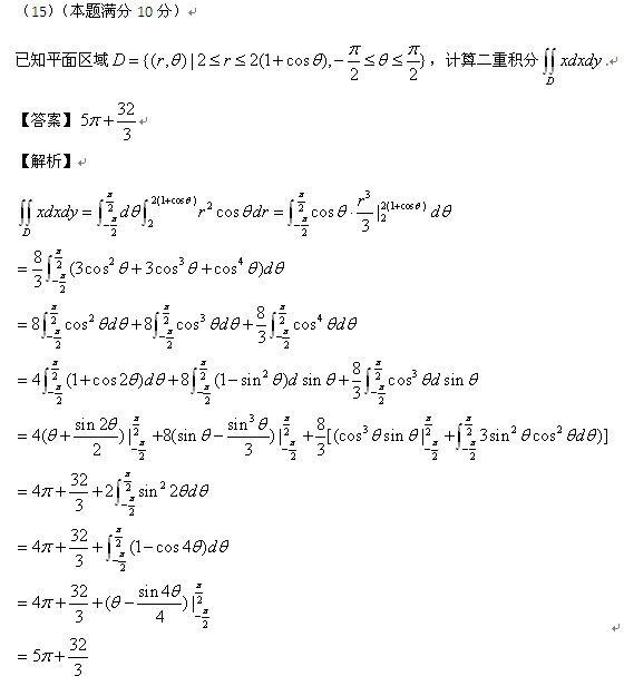 【点评】本题考查二重积分的计算。此知识点在冲刺阶段的数学冲刺串讲班中第一部分高等数学有重点讲解,在强化阶段考研数学强化班高等数学第七章重积分和强化阶段数学重点题型精讲班也均有涉及。